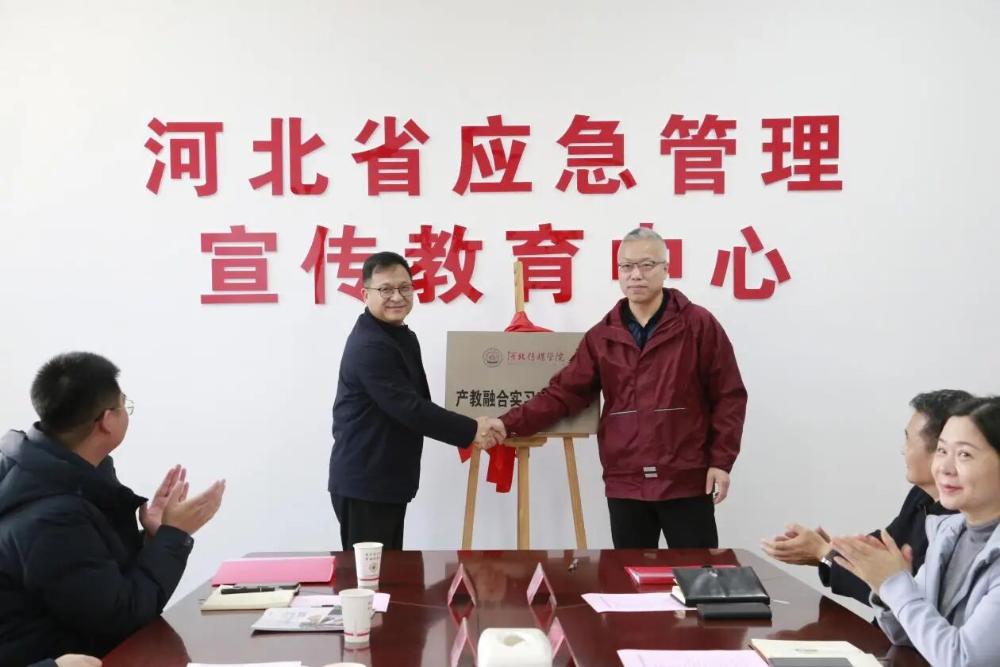在与会人员的共同见证下,河北传媒学院产教中心主任杨子文与河北省应急管理宣教中心副主任何建立分别代表双方在合作协议上签字,并交换协议文本。随后,河北传媒学院副校长李建平与河北省应急管理宣教中心主任宁建立共同为“产教融合实习实训基地”揭牌。