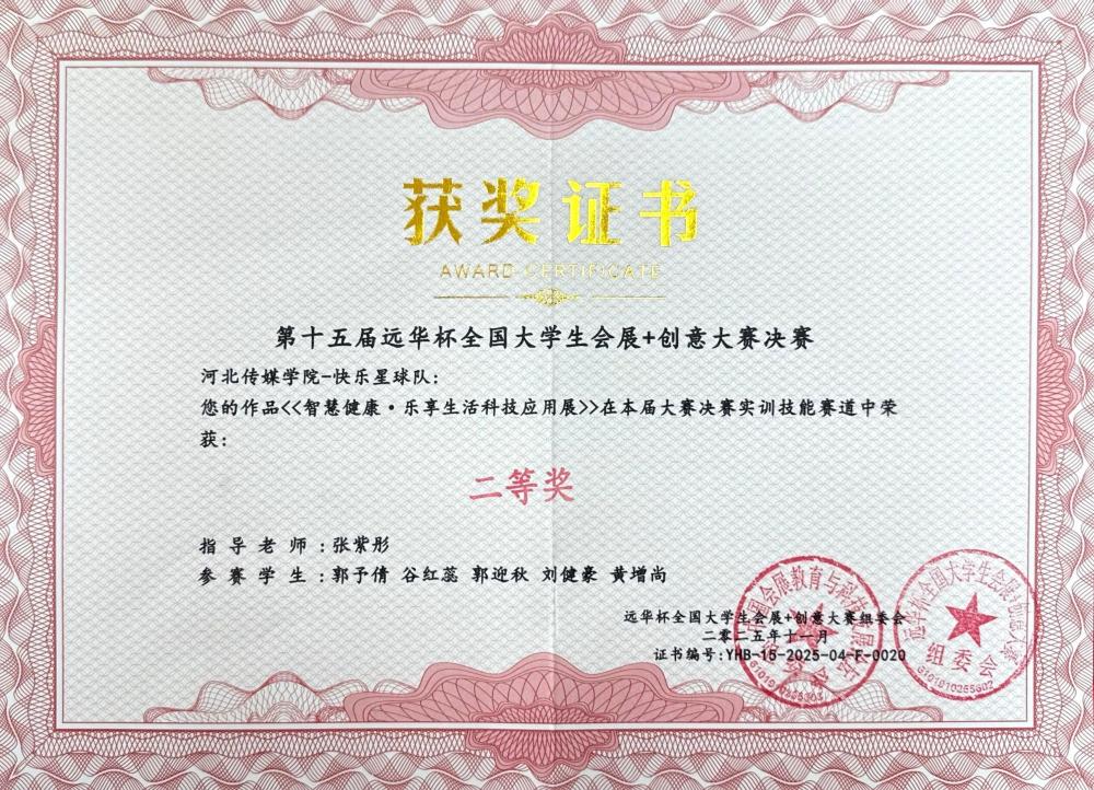 11月7日至9日,第十五届“远华杯”全国大学生会展+创意大赛决赛在广州清远成功举办。作为全国会展专业领域极具影响力的赛事,本届大赛吸引了来自全国87所高校的464支队伍同台竞技,并最终筛选出113支队伍晋级决赛。我校学生凭借出色的综合表现在决赛中斩获多项荣誉:河北传媒学院获教学成果一等奖,“新星之火队”《首届河北文化旅游博览会》、“星河队”《第二十三届中国玩具展》摘得一等奖,其余队伍斩获二等奖5项。
